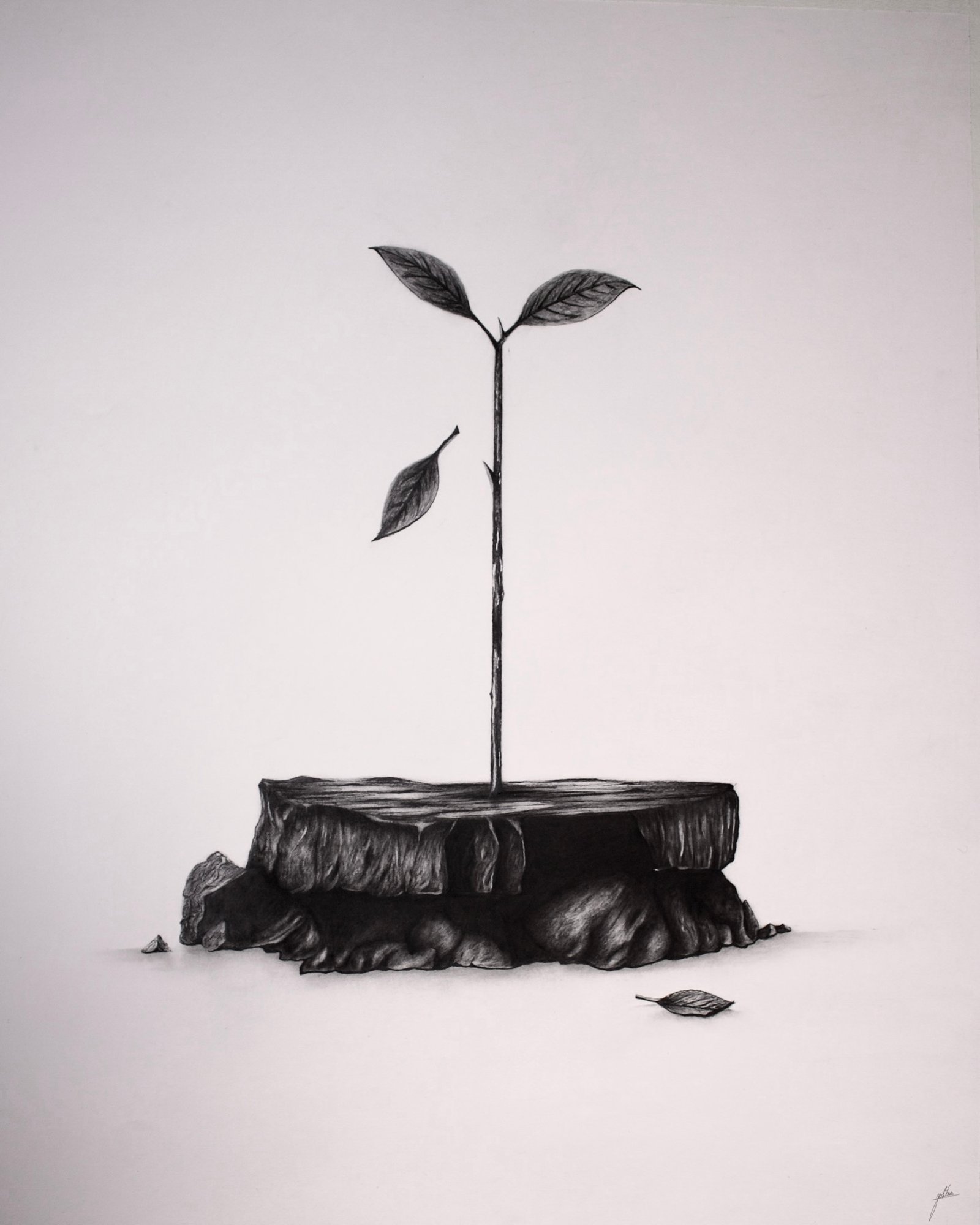 Life doesn’t always begin in fertile ground; sometimes, it simply chooses to stand. This piece reflects the quiet resilience of life, even in the most barren places. Two leaves hold on, while others have drifted away.