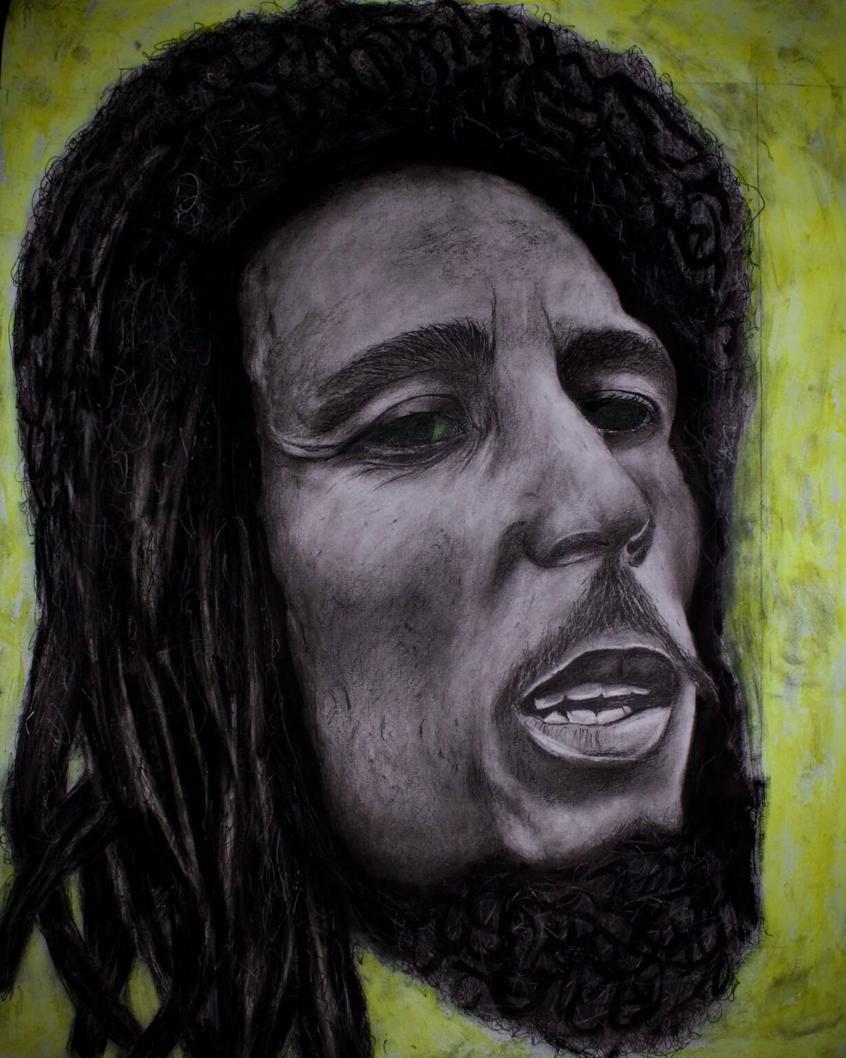 This piece of charcoal Drawing captures his somber expression, reflecting the dark complexity of his life. The deep shadows and intricate details highlight his enduring legacy and symbolizing the haunting reality of his absence. Despite the sadness,this piece conveys how his music continues to heal and inspire. Overall, it’s a poignant tribute to a timeless icon.